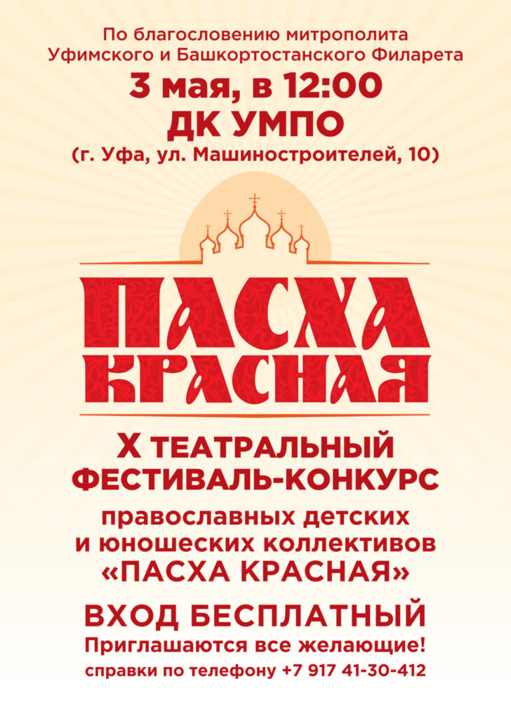 По благословению Главы Башкортостанской митрополии, митрополита Уфимского и Башкортостанского Филарета, 3 мая в 12:00 в ДК «Моторостроителей» г. Уфы состоится X театральный фестиваль-конкурс православных детских и юношеских коллективов — «Пасха Красная 2026».